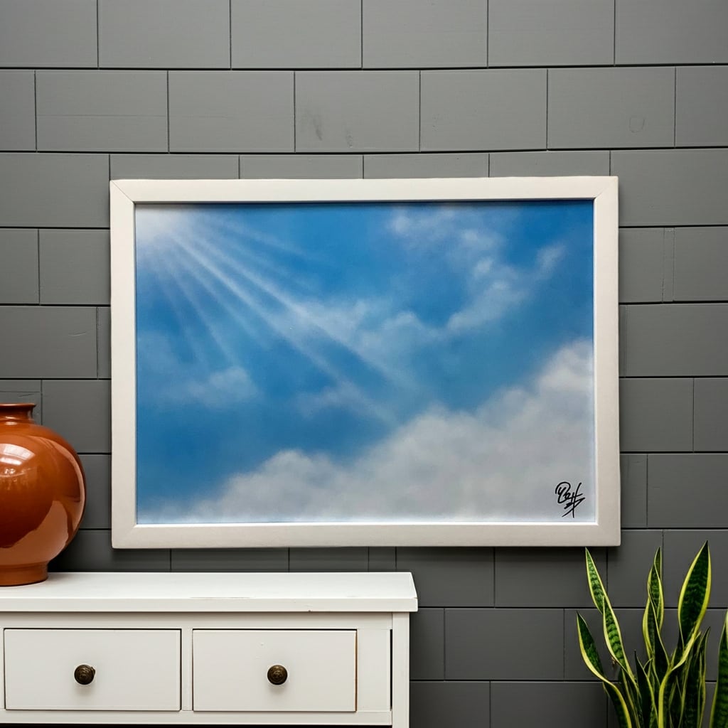 スプレー缶塗料を吹き付けて描く独自の技法を用い、柔らかな日差しから自然の力強さを感じ、太陽の恵みが心に温もりをもたらし勇気を与えてくれるイメージを表現しました。