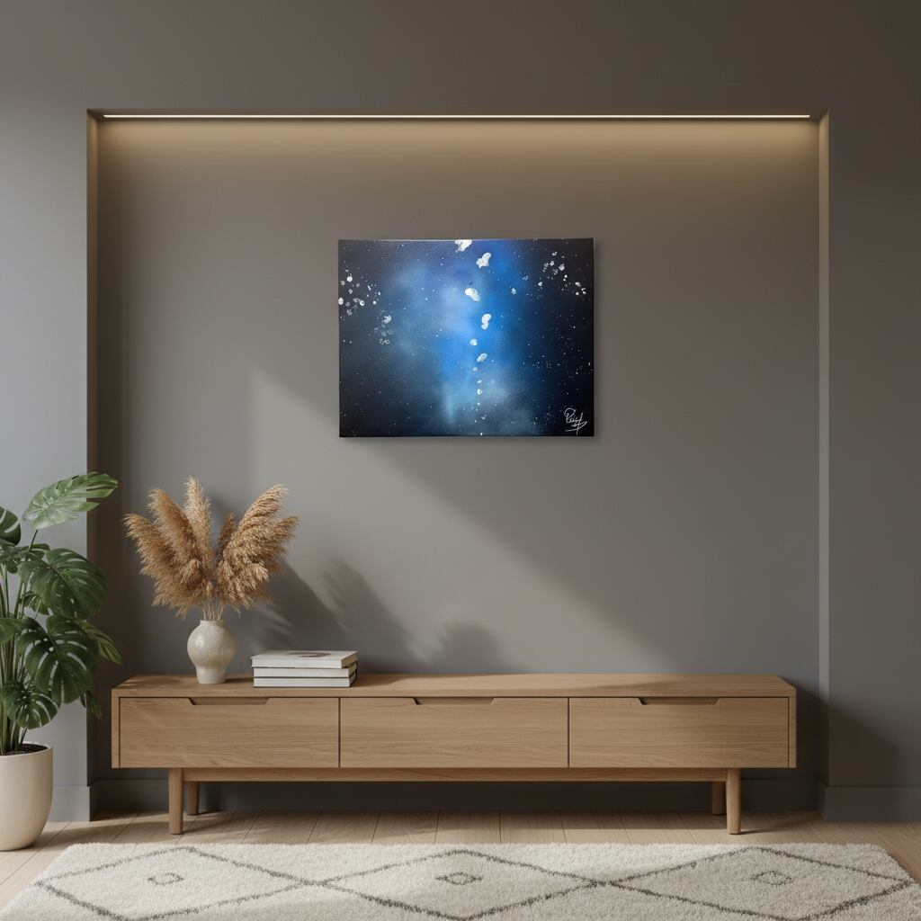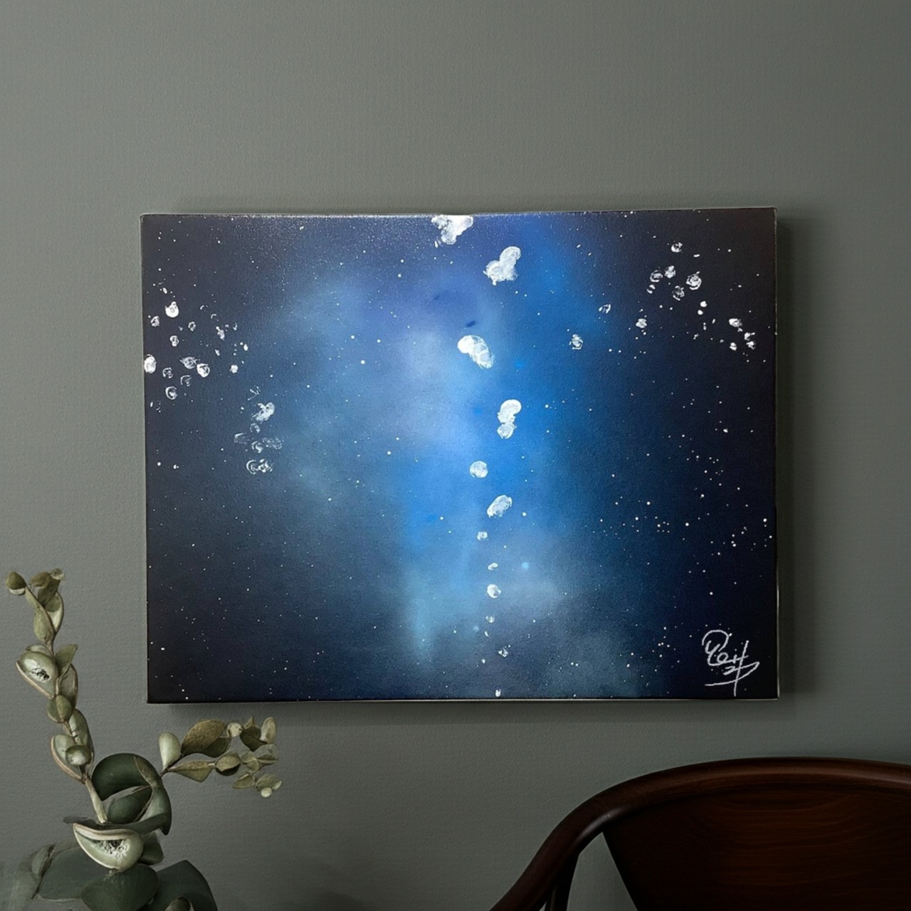 スプレー缶塗料を吹き付けて描く独自の技法を用い、浮かんでは消える思考、形にならない感情、そんなあれこれを夜空に漂わせるように描きました。